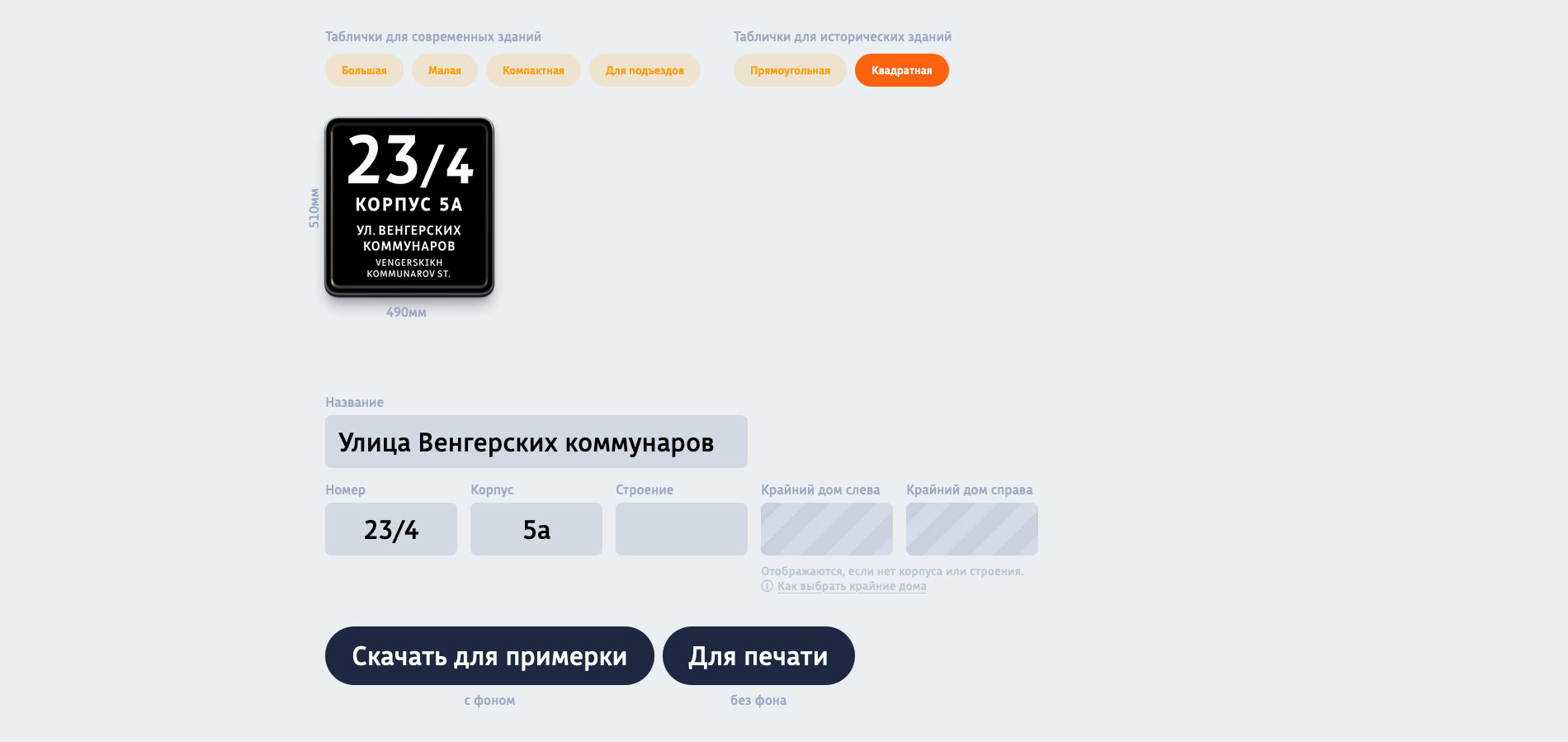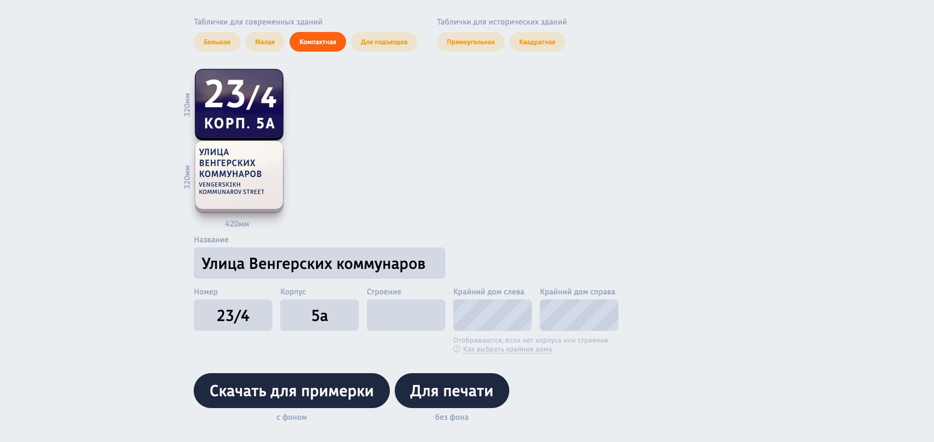 Генератор позволяет создавать PDF-файлы согласно правилам дизайна адресных табличек.